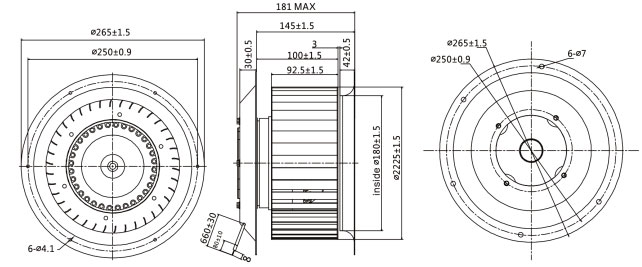 ①技術參數:風輪直徑為225mm,由4極和6極額定電壓為230/400V,頻率50Hz,分單相電容運轉和三相異步運轉電機組成,可提供1800m3/h和1300m3/h的風量要求。