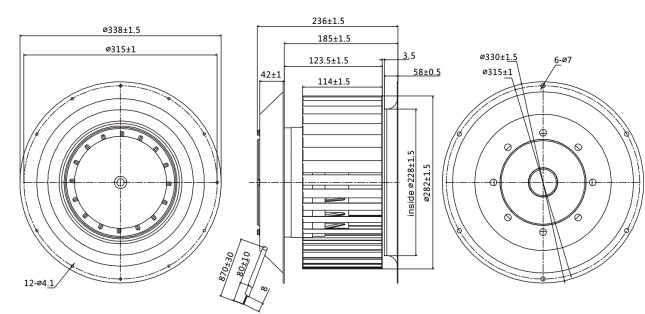 單進風前傾式離心風機根據風機外形可分為蝸殼前傾式離心風機和常規前傾式離心風機兩種。蝸殼前傾式離心風機共有120mm、133mm、140mm、150mm、160mm、180mm等六種。常規前傾式離心風機有200mm、225mm、250mm、280mm、315mm、355mm、400mm、450mm等八種。