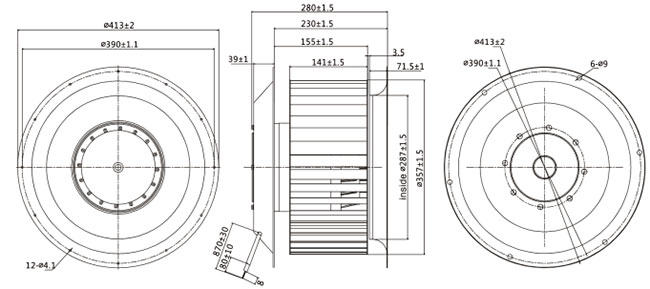 ①技術參數:風輪直徑355mm,由4極和6極額定電壓為230/400V,頻率50Hz三相異步運轉電機組成。最大風量分別為5700m3/h和3900m3/h。