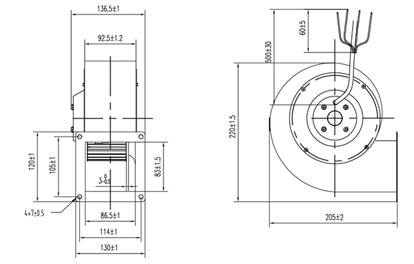 ①性能參數:風輪直徑為150mm,由4極額定電壓為230V,頻率50/60Hz的單相電容電機組成,額定電流分別為0.7A和1.0A,最高轉速可達到2300rpm,可輸送的最大風量為550m3/h。