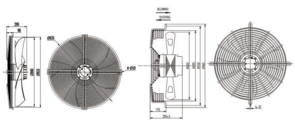 這是一款大型6極和8極三相異步運轉的軸流風機,與之相對應的是每小時25500立方米和18500立方米的超大風量。該款產品輸入功率分別為900W和680W,具有風量大,轉速低、調速范圍廣、運行平穩可靠等優點,電機引出線一般為1.5米,適用于空氣流動量大而壓力要求較小的場合,如作為中央空調風機、高低溫箱等大型通風設備的配套產品。