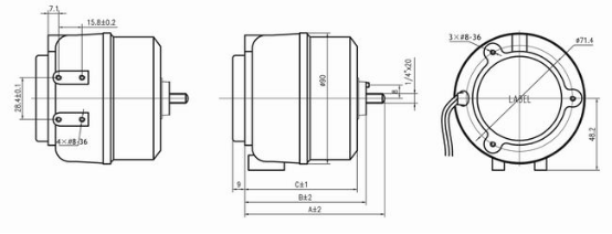 | 型號 | 額定電壓 | 頻率 | 輸入功率 | 輸出功率 | 額定電流 | 轉速 | 轉向 | A mm | B mm | C mm |