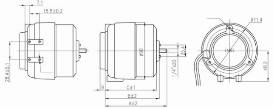 | 型號 | 額定電壓 | 頻率 | 輸入功率 | 輸出功率 | 額定電流 | 轉向 | A mm | B mm | C mm |